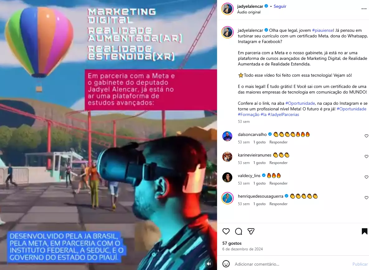 Em 2024, o parlamentar já tinha organizado em seu estado um curso de qualificação em metaverso e realidade aumentada com a empresa de Mark Zuckerberg e, no ano passado, voltou a repetir a dobradinha para promover um evento sobre empreendedorismo digital em Teresina (PI).