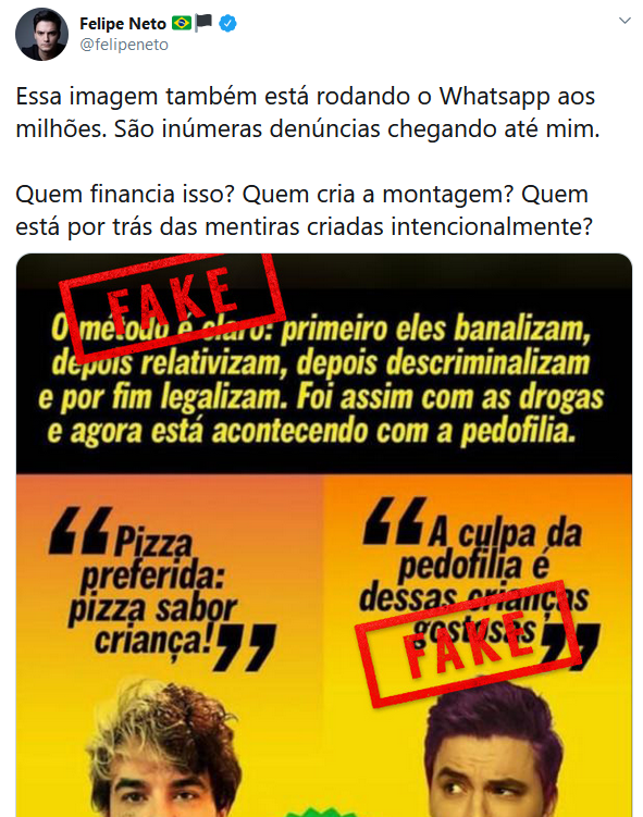 Histórico. As publicações que atribuem comentários pedófilos a Felipe Neto vão ainda na contramão de posicionamentos públicos dele sobre o tema. Em 2019, ele denunciou uma estratégia que facilitava que pedófilos consumissem vídeos de crianças no YouTube. Já em março deste ano, ele criticou reportagem do Fantástico em que o médico Dráuzio Varella abraça uma condenada pelo estupro e assassinato de uma criança: “eu não concordo com vitimização de autores de crimes hediondos”.