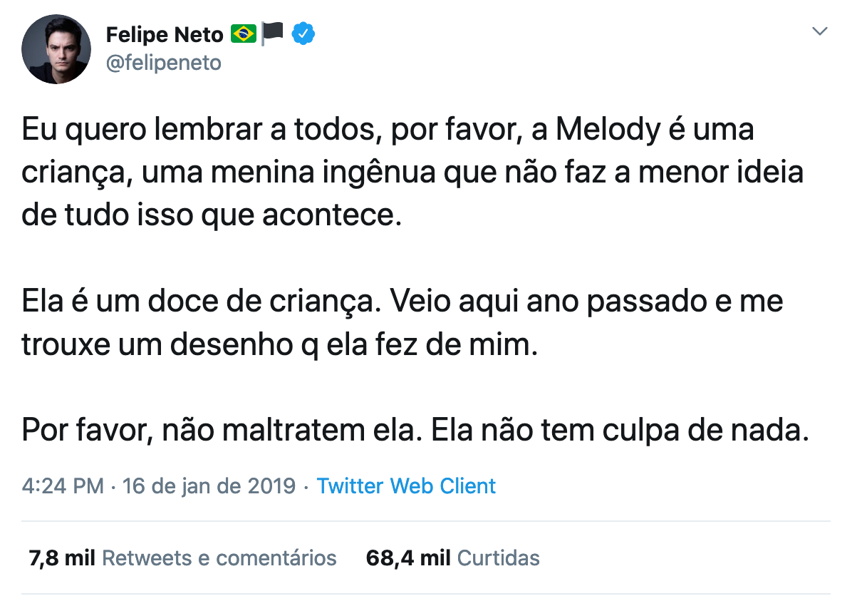 No perfil de Felipe Neto hoje há apenas um tweet que traz as palavras “criança” e “doce”. Nele, o youtuber critica os ataques direcionados à cantora Mc Melody.