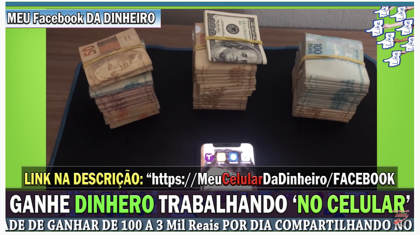 Dinheiro fácil. Uma série de outros anúncios que aparecem em canais de bolsonaristas anuncia cursos que prometem ensinar a ganhar milhares de reais pelo celular. Uma inserção em um vídeo do canal Top Tube Famosos, por exemplo, apresenta o curso "Robô Milionário" e mostra a imagem de um smartphone cercado de pilhas de cédulas de dinheiro.